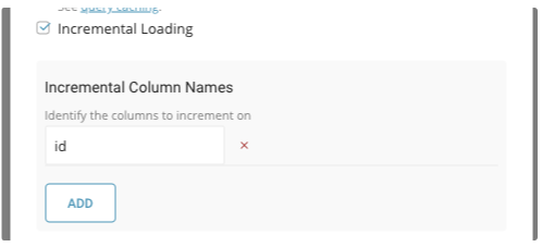 To enable it, check Incremental Loading, then specify column names to increment into "Incremental Column Names." Only numerical types (INTEGER and FLOAT) and TIMESTAMP type are supported as an incremental column.