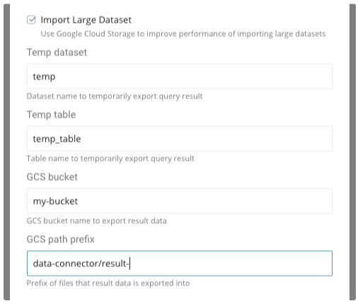 To enable this option, check Import Large Dataset then specify "Temp dataset", "Temp table", "GCS bucket" and "GCS path prefix". The "Temp dataset" must be created manually in advance.