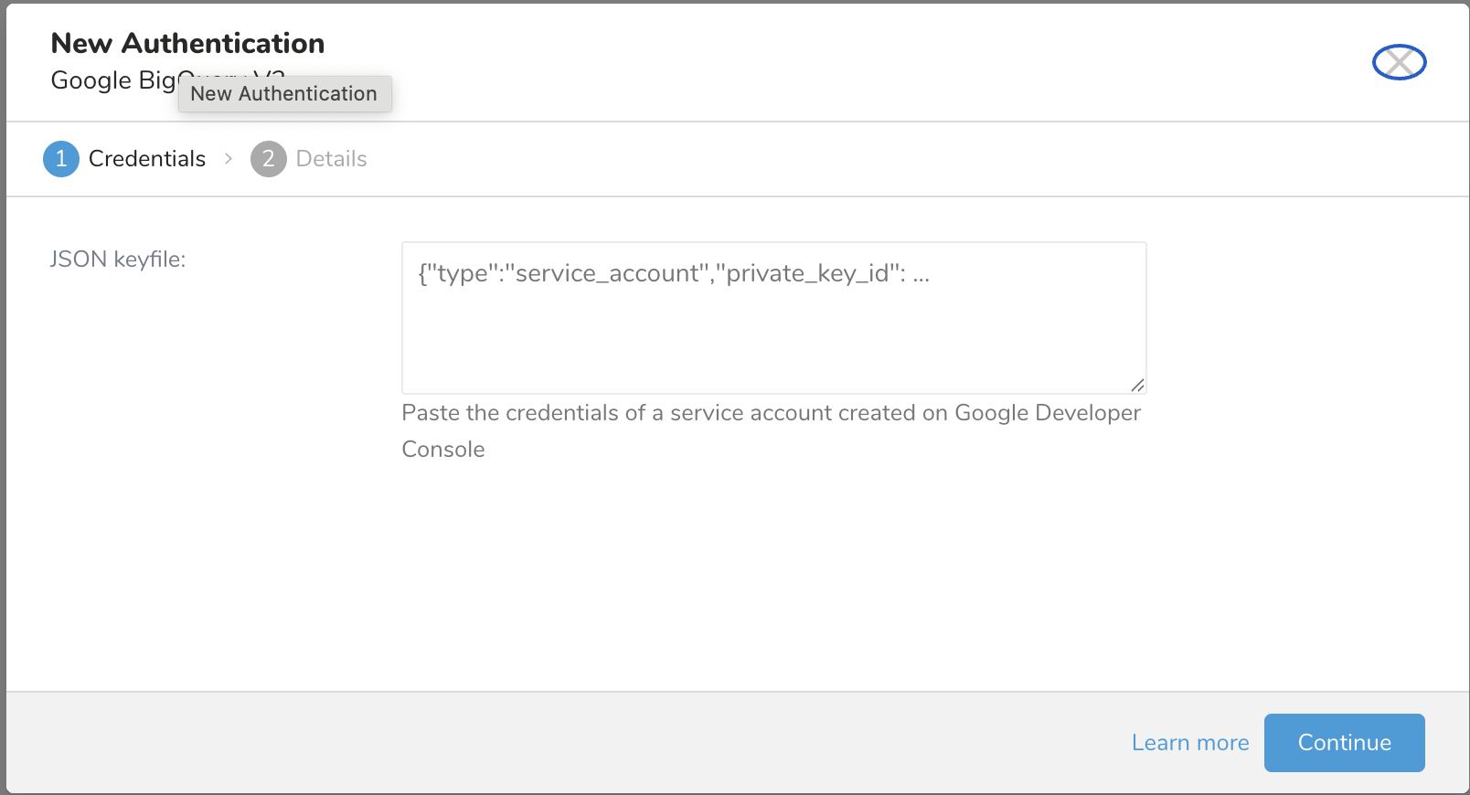 - Provide the JSON string of your service account key into the "JSON keyfile" section.