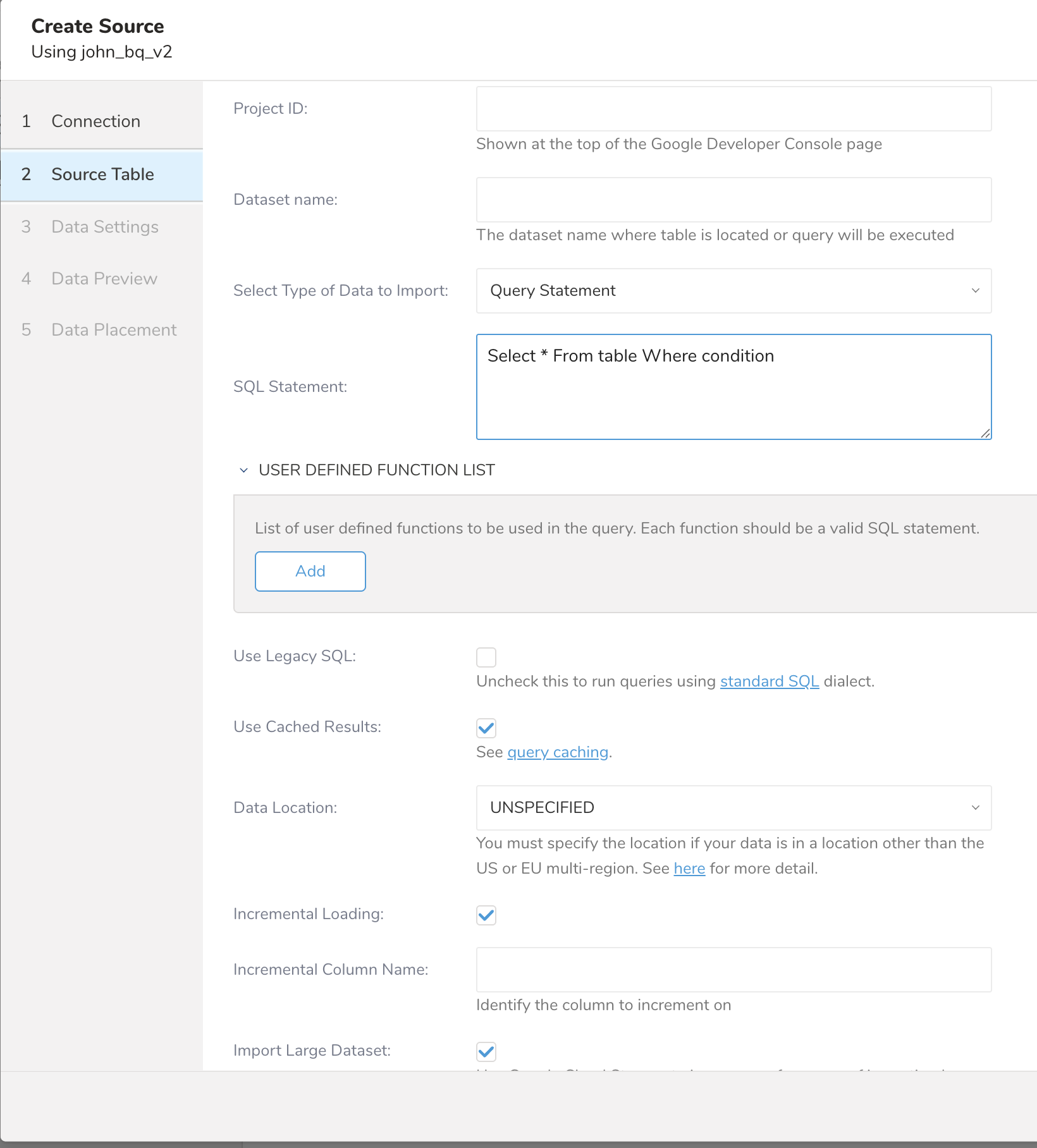 Configure the data source to import. Input an ID of your Google Cloud Platform project into "Project ID". Input a dataset name where store your table