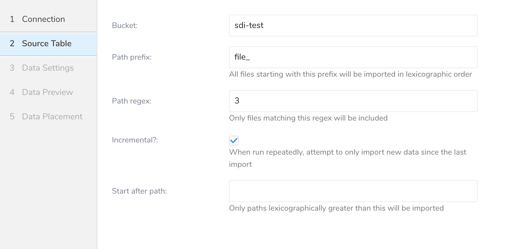 | Path Regex | regexp to match file paths. If a file path doesn’t match with this pattern, the file is skipped. (Ex. .csv$ # in this case, a file is skipped if its' path doesn’t match with this pattern.) |