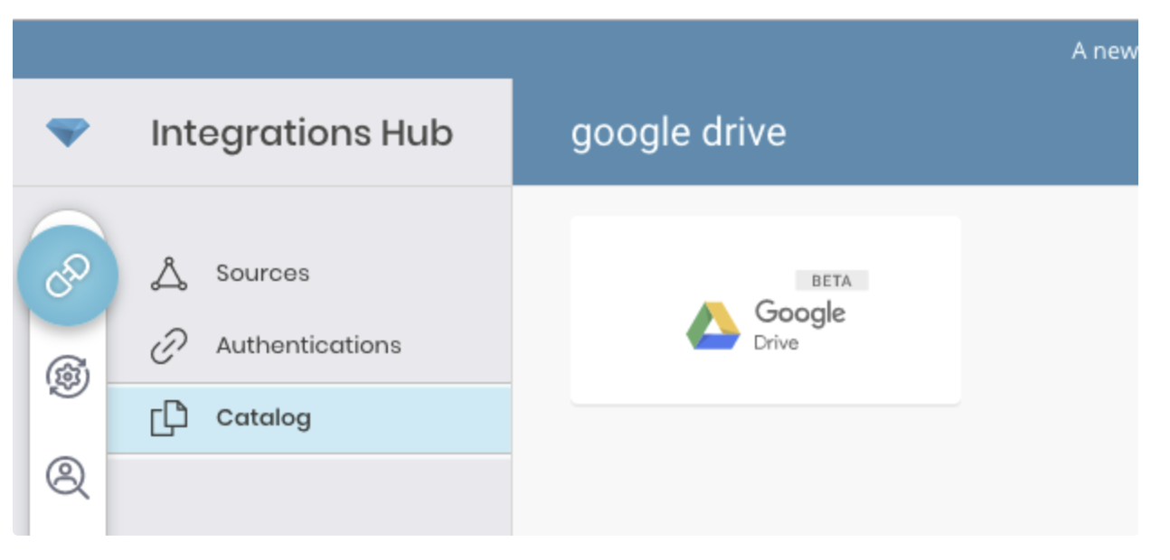 Go to Integrations Hub > Catalog and search and select Google Drive.