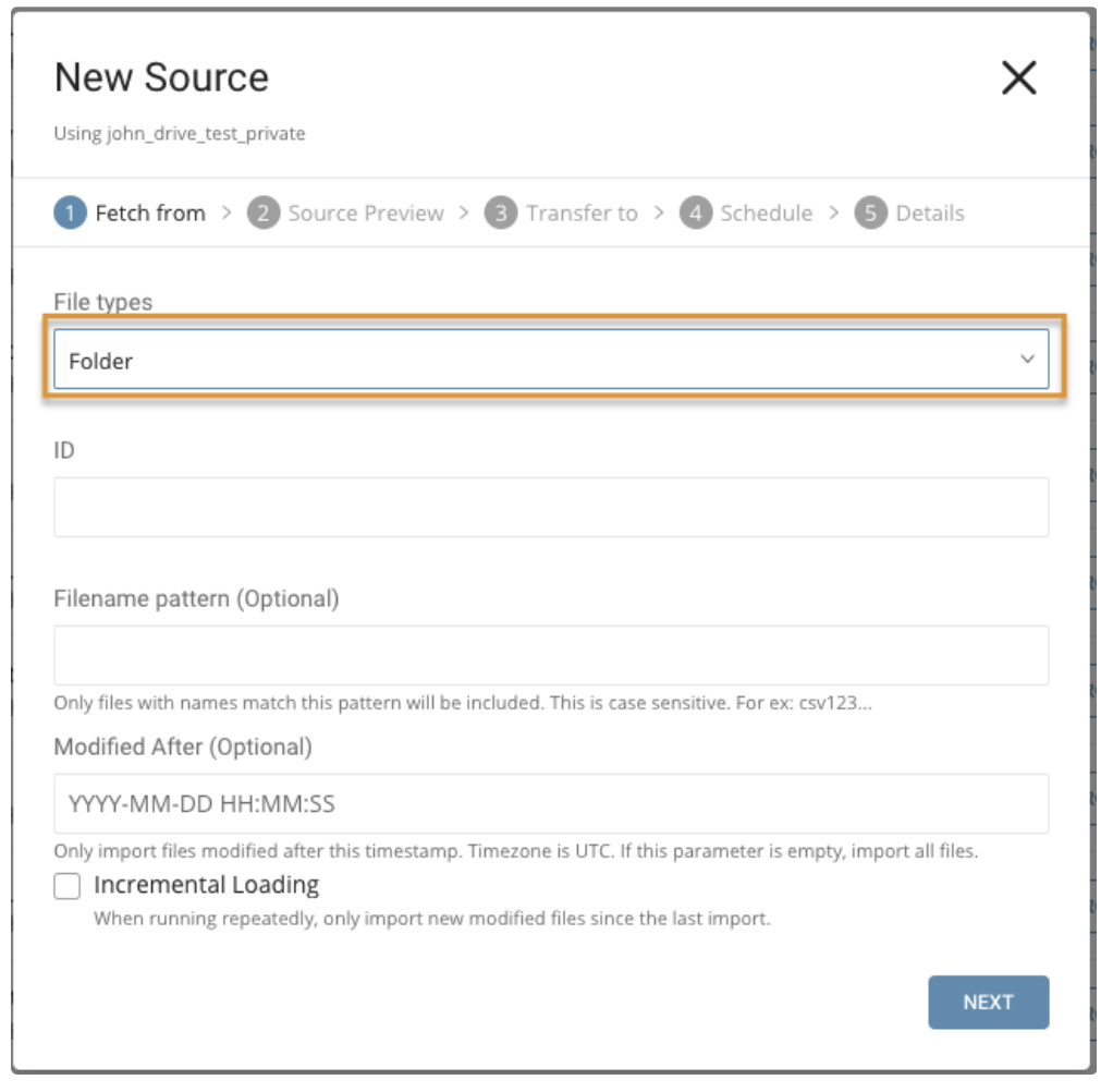 - Incremental Loading: Use when importing data based on a schedule. Use to import only new, modified files inside the folder since the last import.
