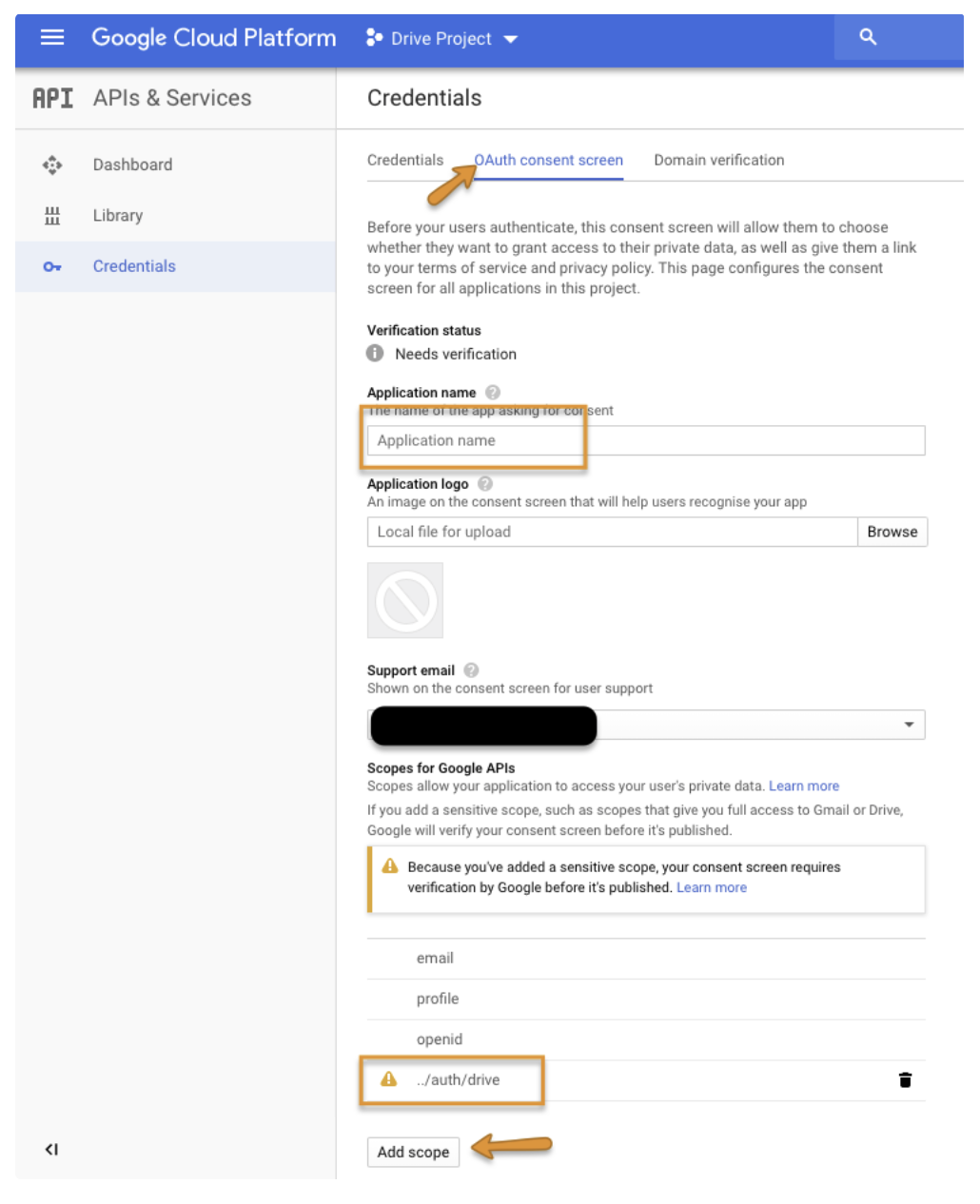 Go to the OAuth consent screentab, provide the Application name, then select Add scope to add the /auth/drive scope then Save.