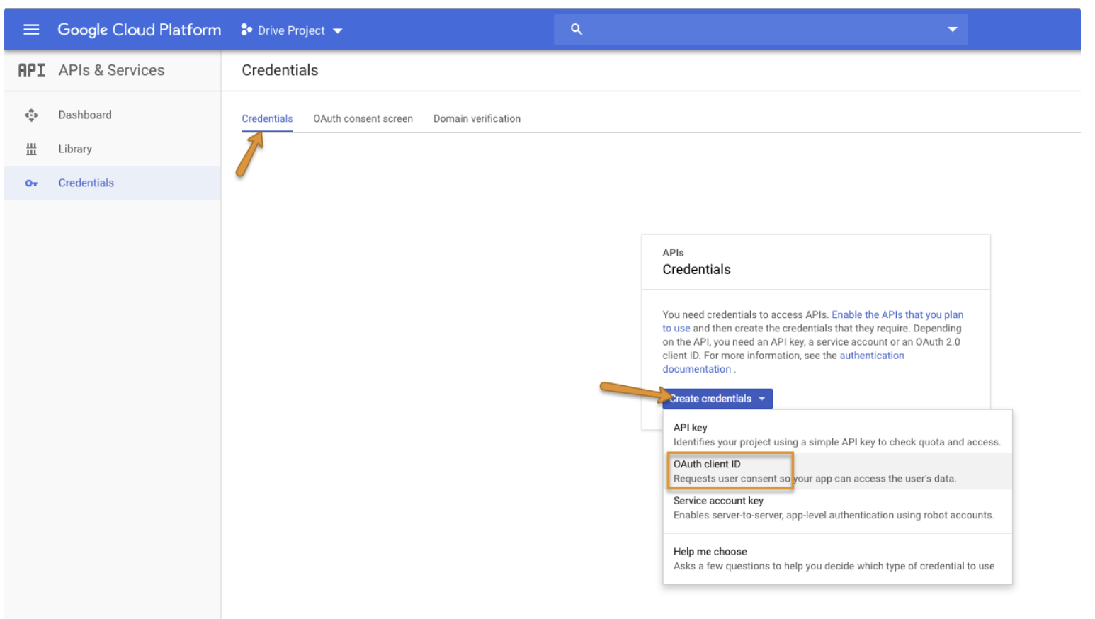 Go to the Credentials tab and click Create credentialsthen select OAuth client ID.