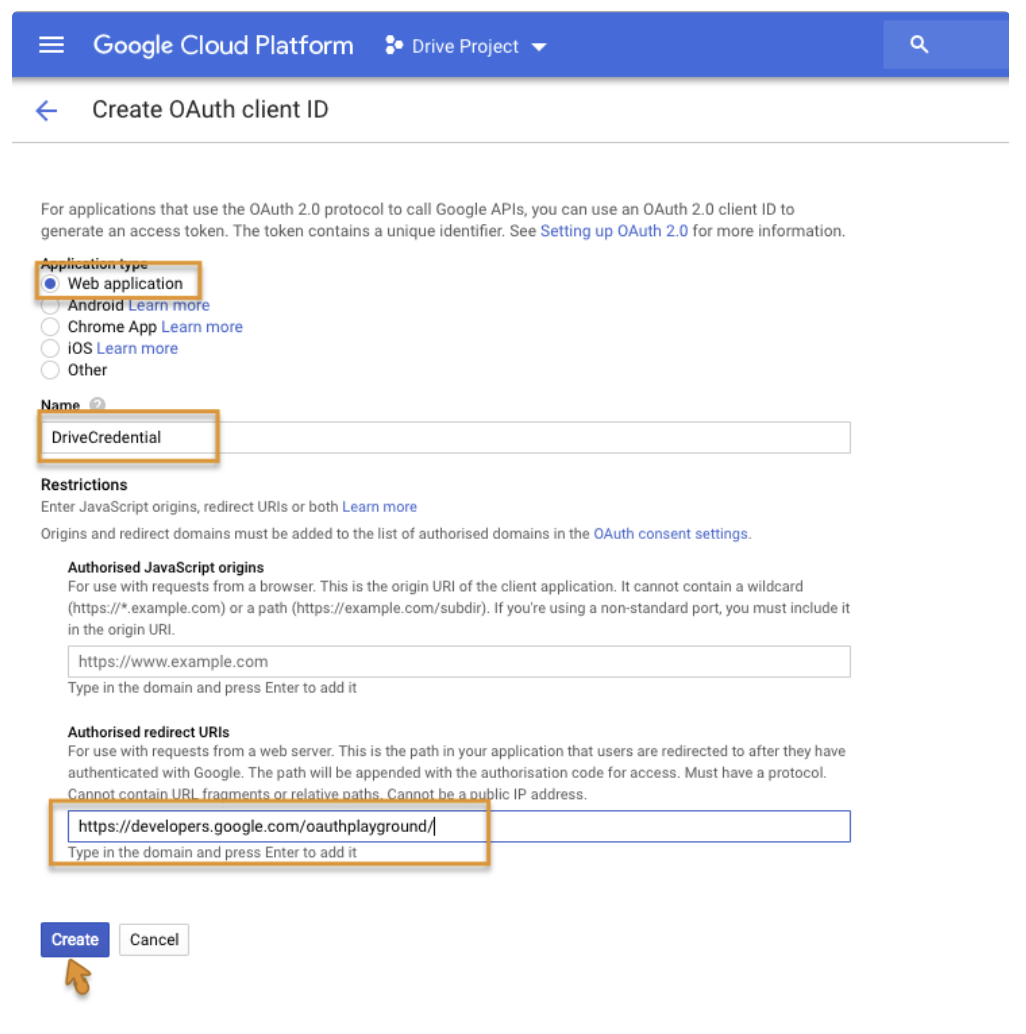 Name your credential and add a redirect URL to https://developers.google.com/oauthplayground/