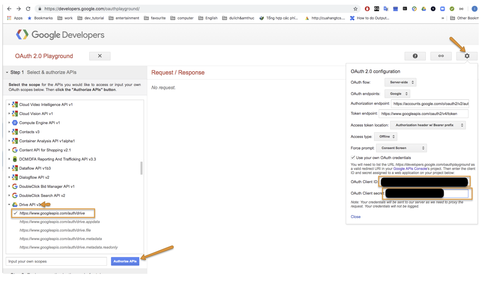 First, select Drive API v3 and scope **auth/drive,**select Settings and provide your **client id, client secret,**that you can get from your credential, then select Authorize APIs.