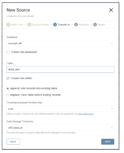 Choose an existing source or create a new database and table.
