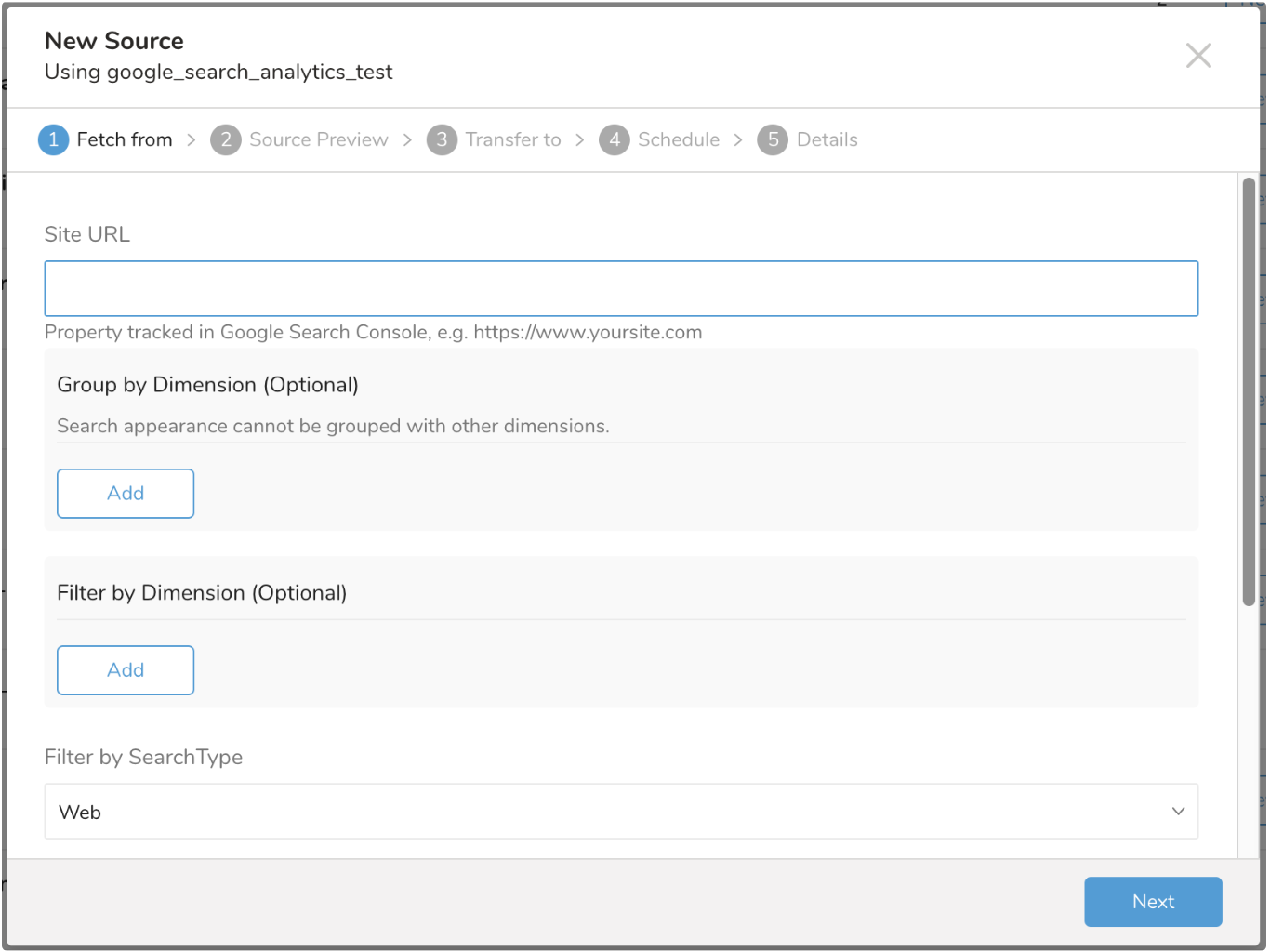 You can group the data you import by dimensions, one or more. Supported Dimensions are: Page, Country, Device, Query, and Search Appearance.