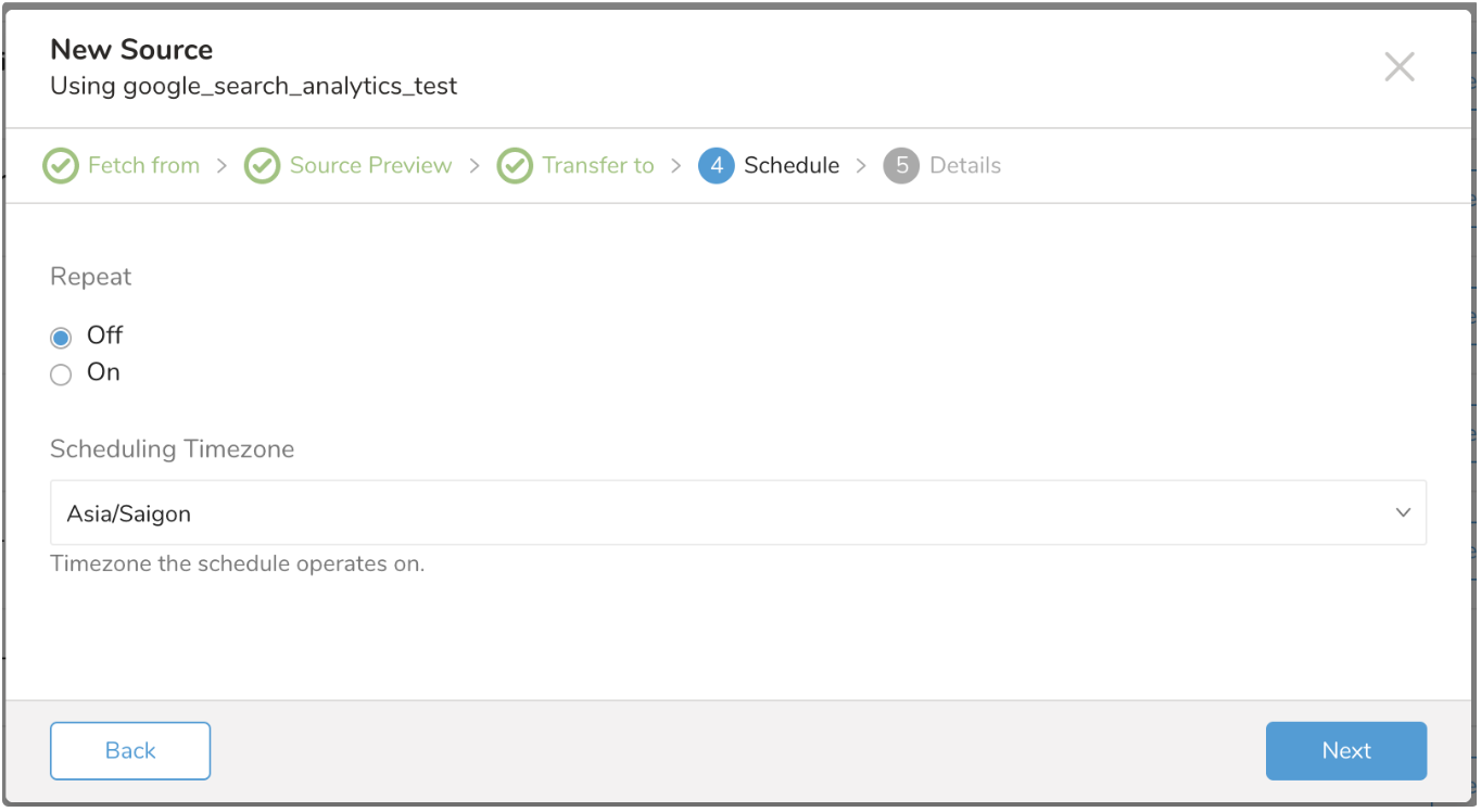 You can create a schedule using the td connector:create command. The following are required: the name of the schedule, the cron-style schedule, the database and table where their data will be stored, and the data connector configuration file.
