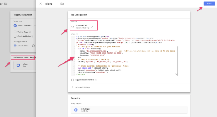 You can track links users click by setting the Click Trigger, which sends an additional JavaScript tag with your data and the {{Click URL}} variable to Treasure Data. The {{Click URL}} variable contains the URL information of the link. You can use the Click Trigger to track when users have clicked links to external sites on which you cannot track page-view. Google Tag Manager variables make your tracking more adaptable. They are like containers that hold changing values, so you are able to take information for your website's context and pass it to your tags, making your tracking and analytics setup more customizable.