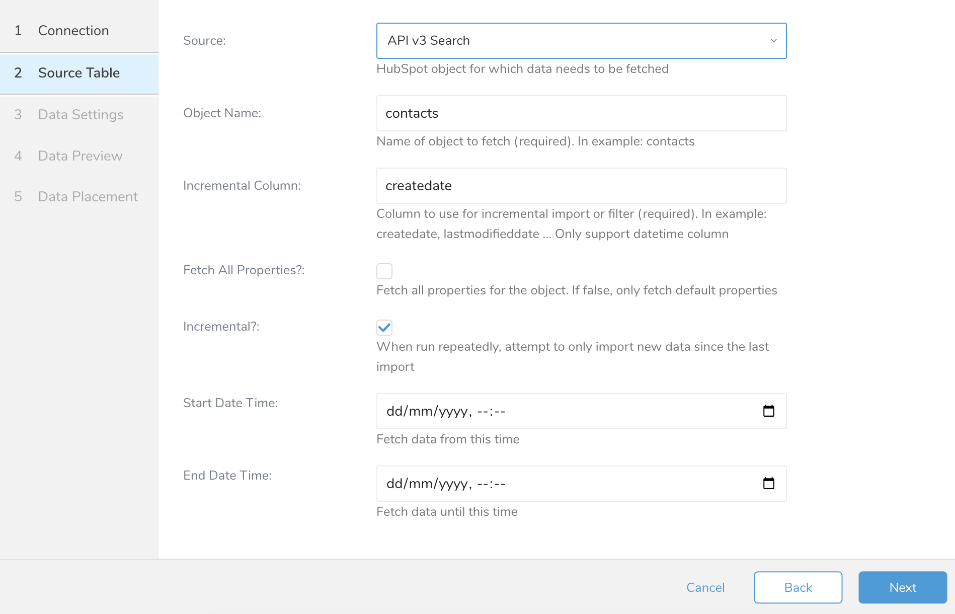 - Start date: date from which to fetch data objects in HubSpot