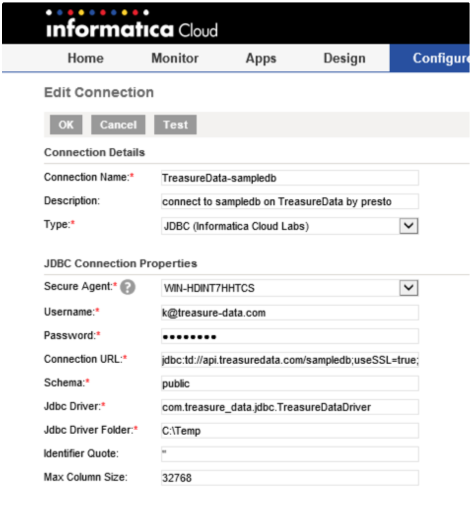 Third, install and configure the Treasure Data’s JDBC driver in Informatica Cloud. Refer to: