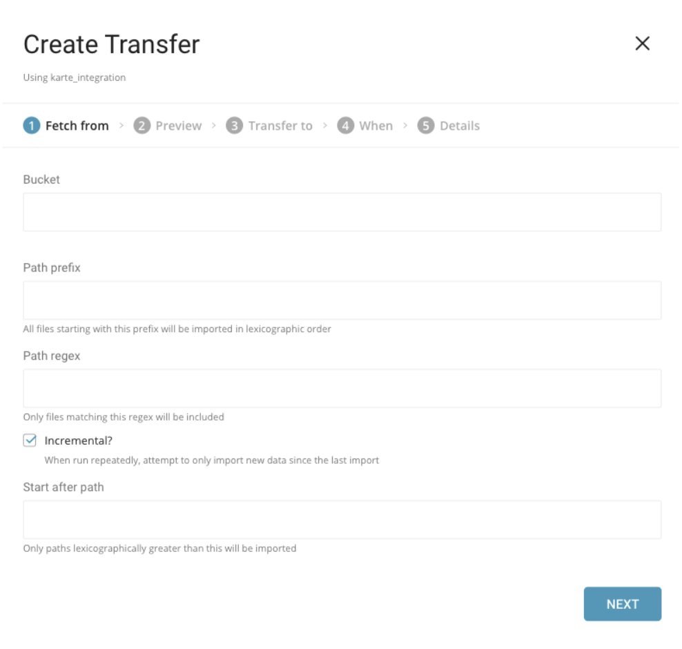 For the scheduled import, the Data Connector for KARTE imports all files that match with the specified prefix (e.g. path_prefix: path/to/sample_ –> path/to/sample_201501.csv.gz, path/to/sample_201502.csv.gz, …, path/to/sample_201505.csv.gz) at first and remembers the last path (path/to/sample_201505.csv.gz) for the next execution.