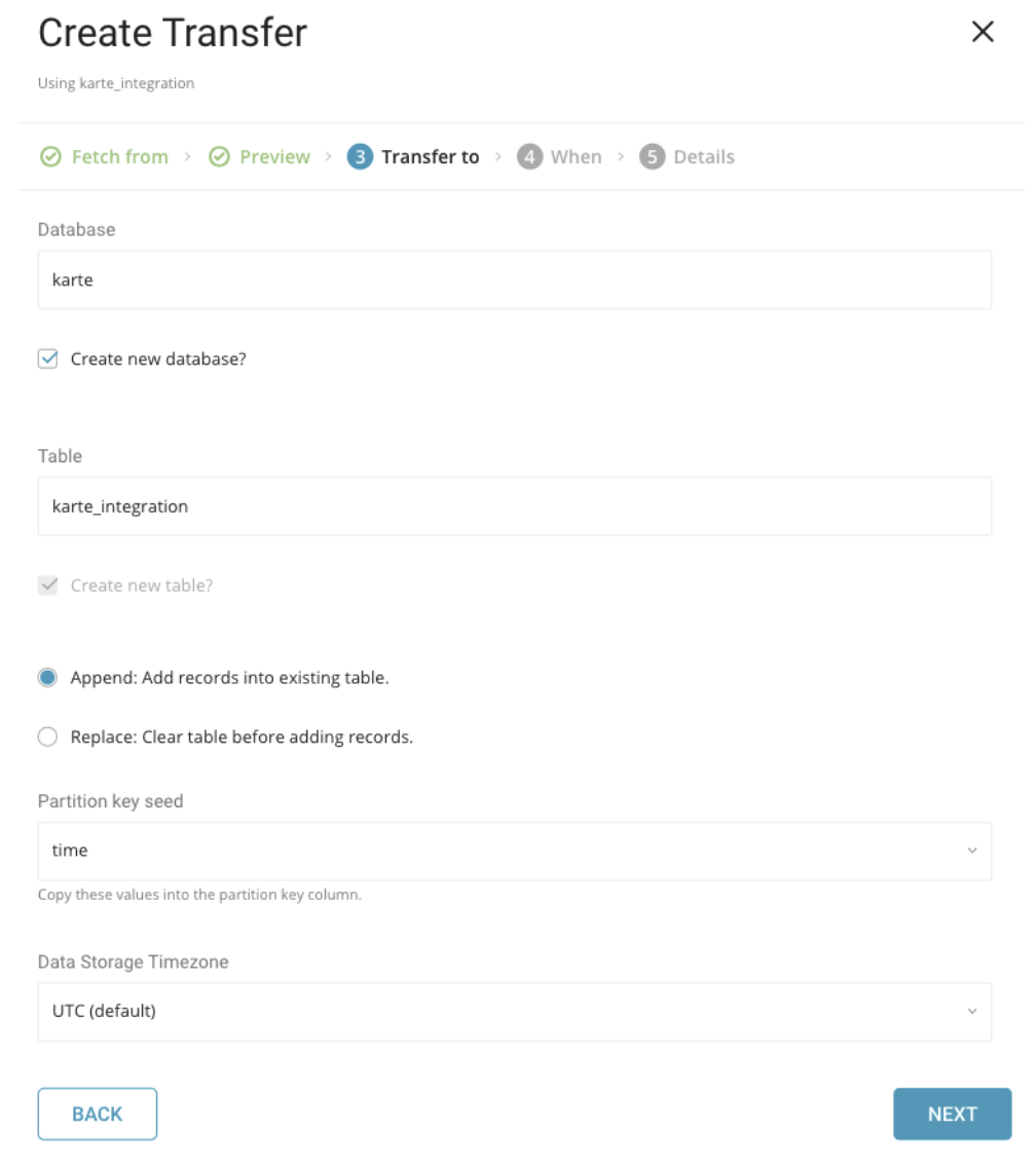 - Mode: Append or Replace. Select whether to append records to an existing table or replace your existing table.
