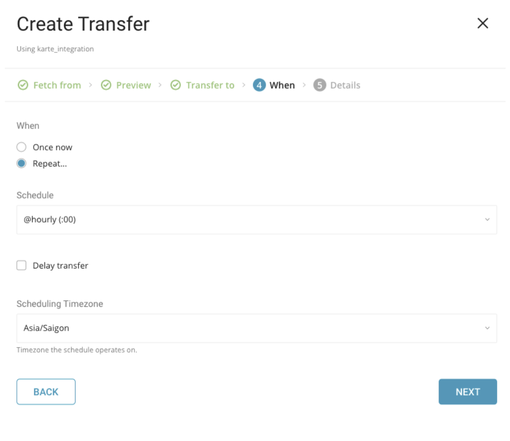 $ td connector:issue load.yml --database td_sample_db --table td_sample_tableUsing our high availability scheduler, you can schedule periodic Data Connector to run for incremental KARTE file imports. By using this feature, you no longer need a cron daemon on your local data center.