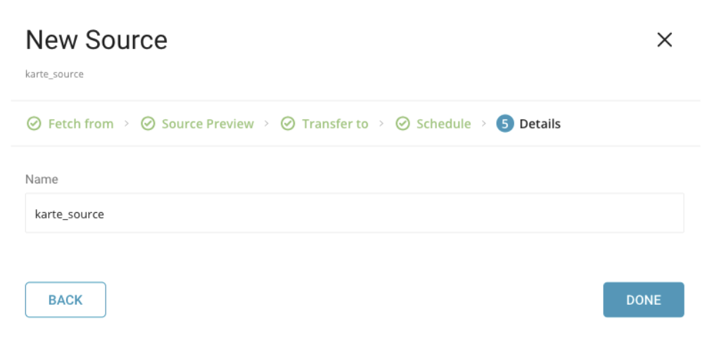 Create a name for your source and then select DONE to save your KARTE connector as a new source.