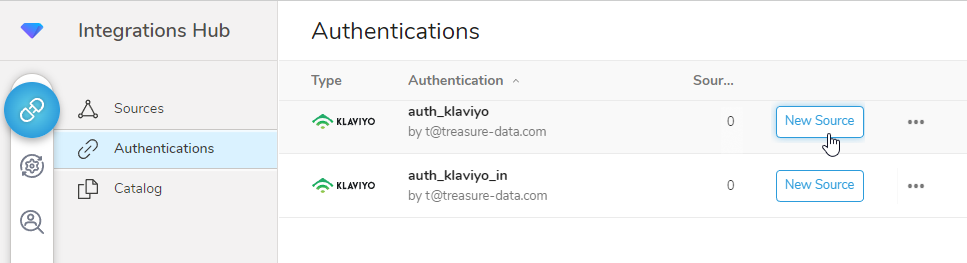 - Locate the Klaviyo authentication and select New Source.