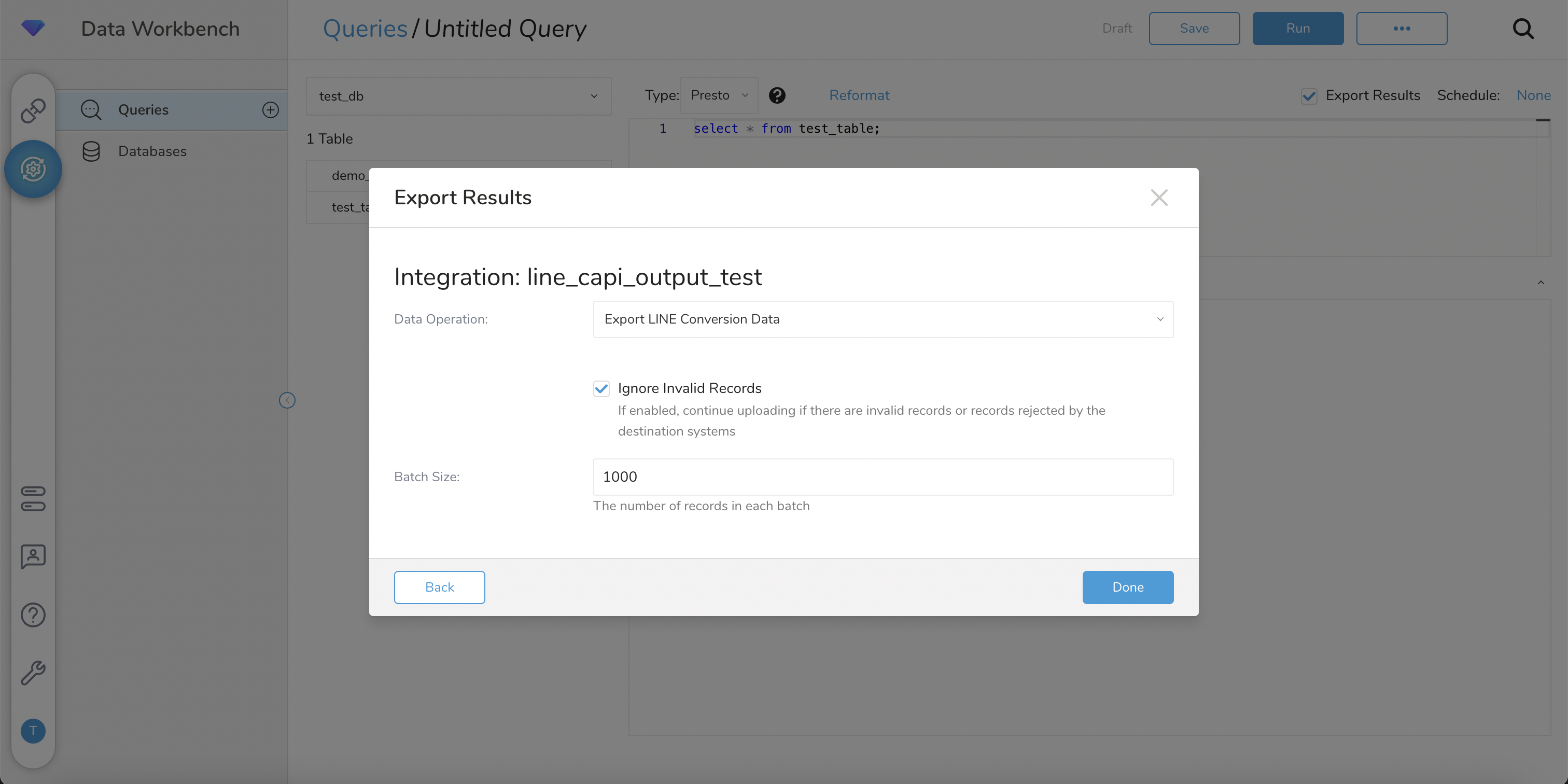 select * from line_capi_tblYou can use Scheduled Jobs with Result Export to periodically write the output result to a target destination that you specify.