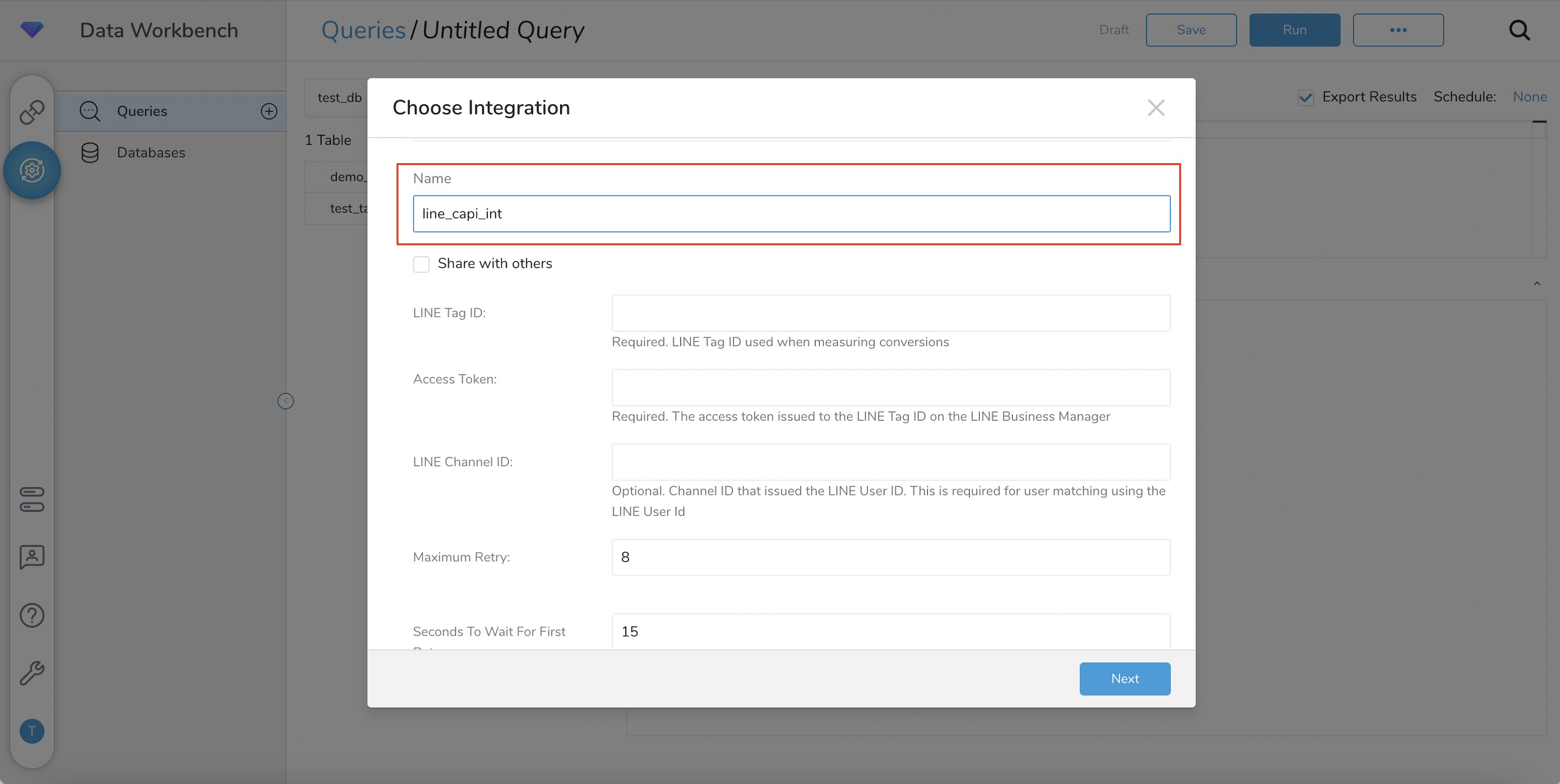 You can create or reuse a query. In the query, configure the data connection. You need to define the column mapping in the query. The columns in the query represent Event data to be uploaded into LINE.