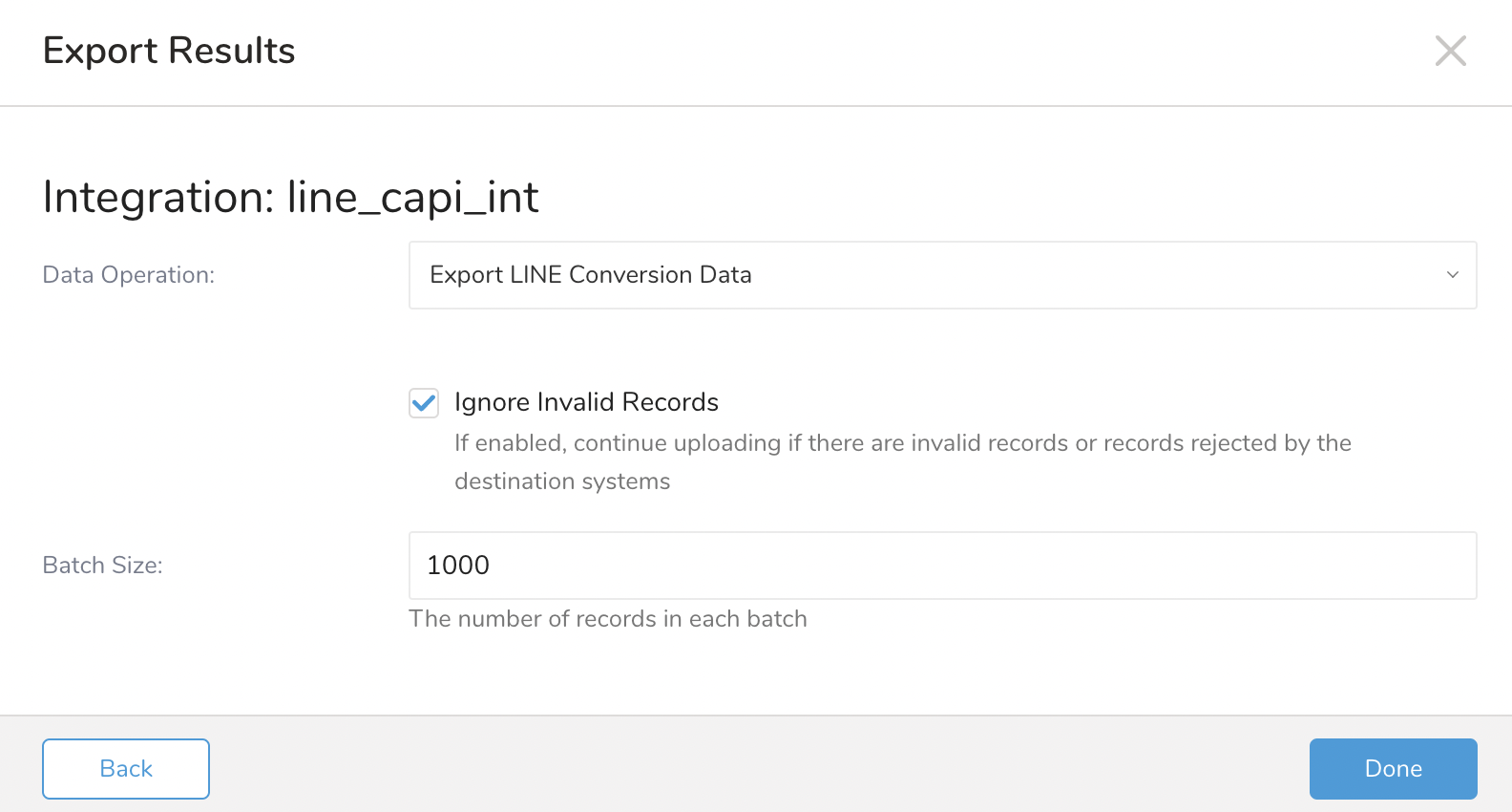 | Batch Size | The number of events in each batch to submit to LINE Conversion API. Default is 1000, Min: 1000, Max: 100000. |