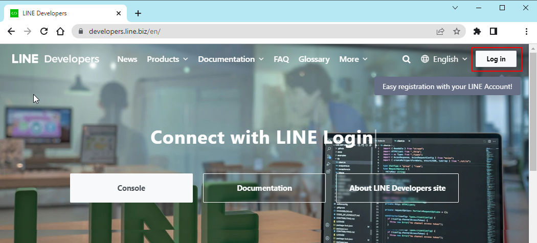 }- Go to https://developers.line.biz/en/ and select login in the top right corner.