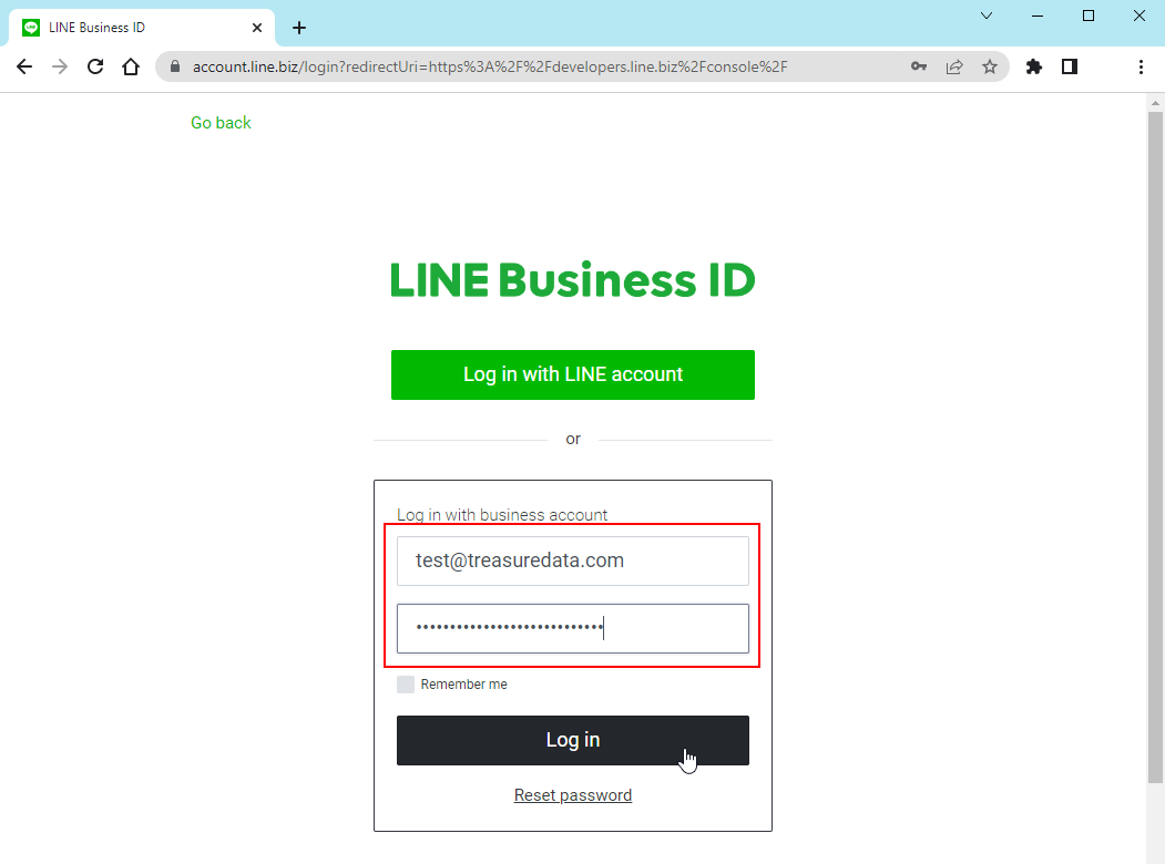 - Enter your official LINE account's user name and password and select Log in.