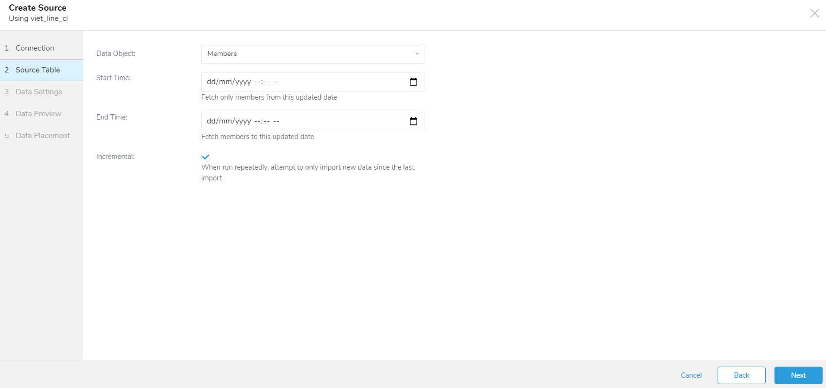 | Start Time (Optional show if selecting Members Data Object) | For UI configuration, you can pick the date and time from the supported browser, or input the date that suits the browser expectation of date-time. For example, on Chrome, you will have a calendar to select Year, Month, Day, Hour, and Minute; on Safari, you need to input the text such as 2020-10-25T00:00. For CLI configuration, we need a timestamp in RFC3339 UTC "Zulu" format, accurate to nanoseconds, for example: "2014-10-02T15:01:23Z". |