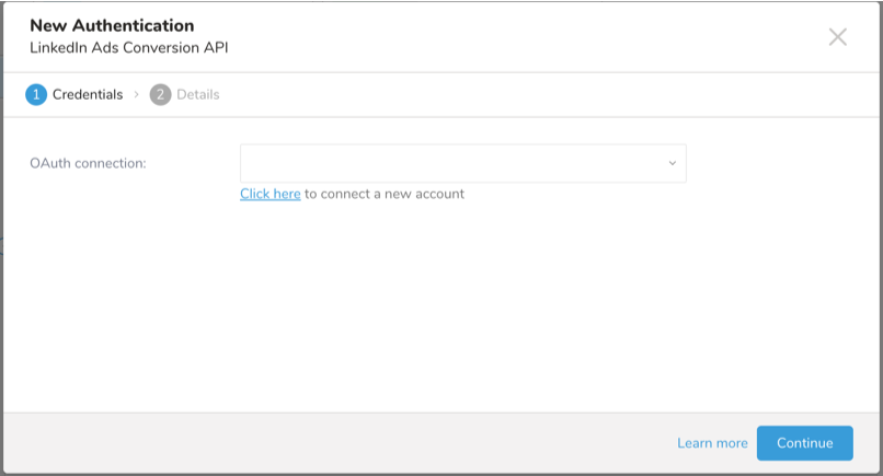 - Select an existing LinkedIn CAPI authentication or create a new one described previously