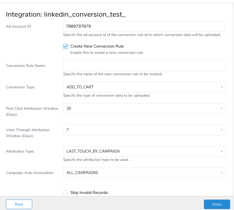 | Conversion Rule | A input field to for specifying an existing conversion rule from your LinkedIn Ad Account. This field is only available when neither “Use Conversion Rule ID” nor “Create New Conversion Rule” options are selected. |