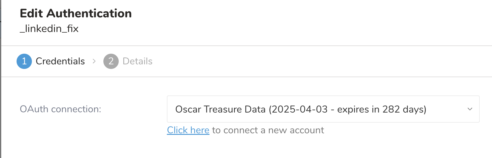 - Select Click here to connect to a new account. You are redirected to LinkedIn to log in, if you haven't logged in yet, or to the Consent page to grant access to Treasure Data.