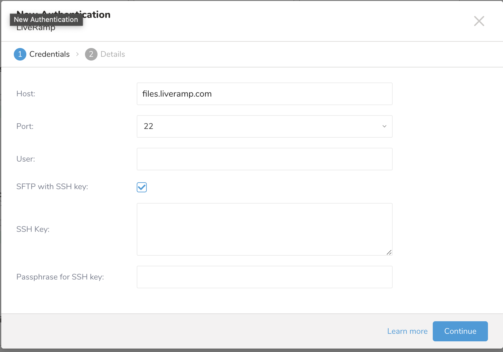 Edit the required credentials: Host: The host information of the LiveRamp SFTP Server (default files.liveramp.com) Port: Select port 22 or 8442 User: Username to connect to LiveRamp SFTP Server. Password: Password to connect to LiveRamp SFTP Server if you don't use SSH key. SFTP with SSH Key: Checkbox to use SSH key to connect to SFTP Server. SSH Key: The content of the private key. Passphrase: The passphrase of the SSH key. Note: The content of the private key must be in RSA format. For example: