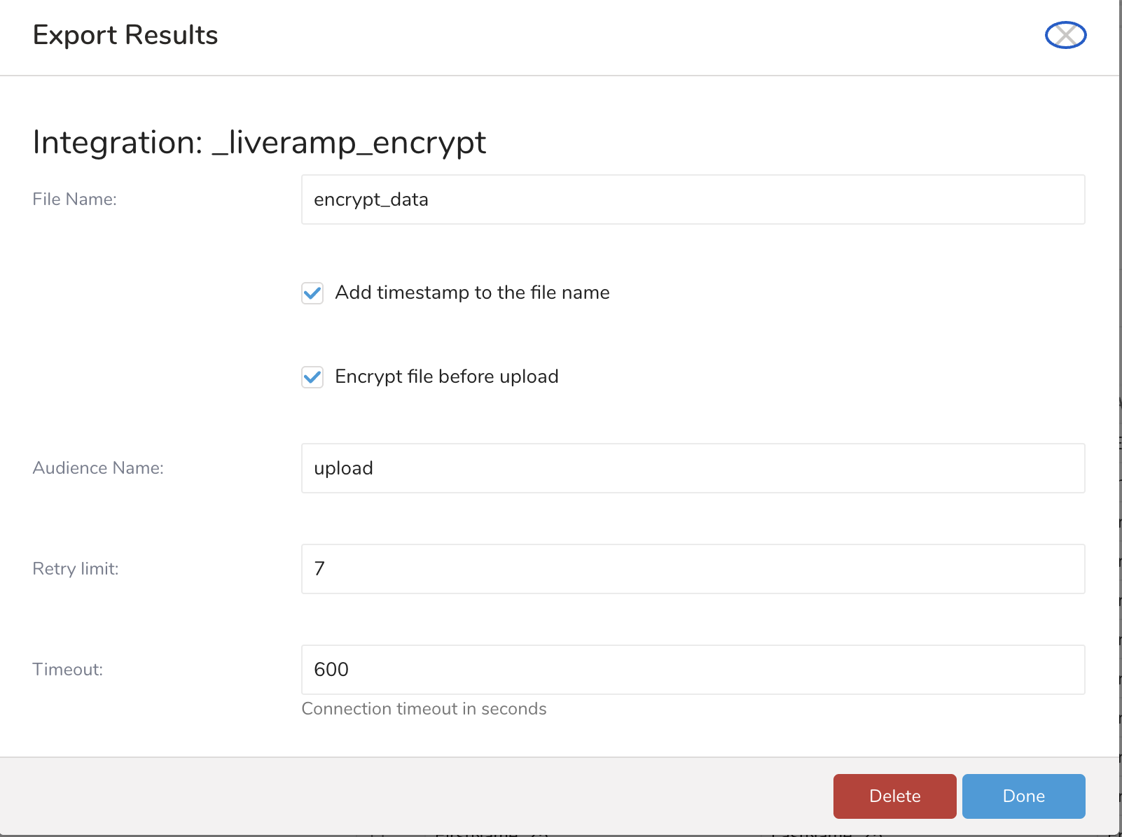 - Connection timeout in seconds: the amount of time allotted for connecting to the Liveramp SFTP Server (default: 600)