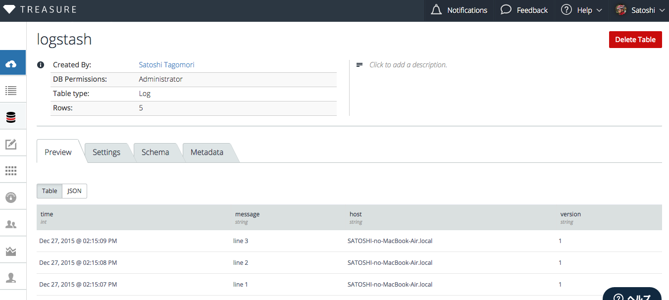 $ bin/logstash -f your.confYou can see rows of your data in TD Console. Log message texts are stored in message column, and some additional columns will exist (for example: time, host and version).