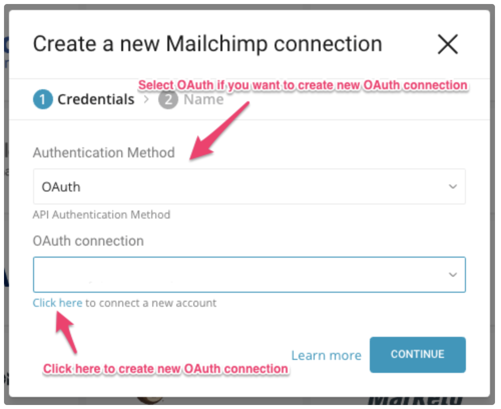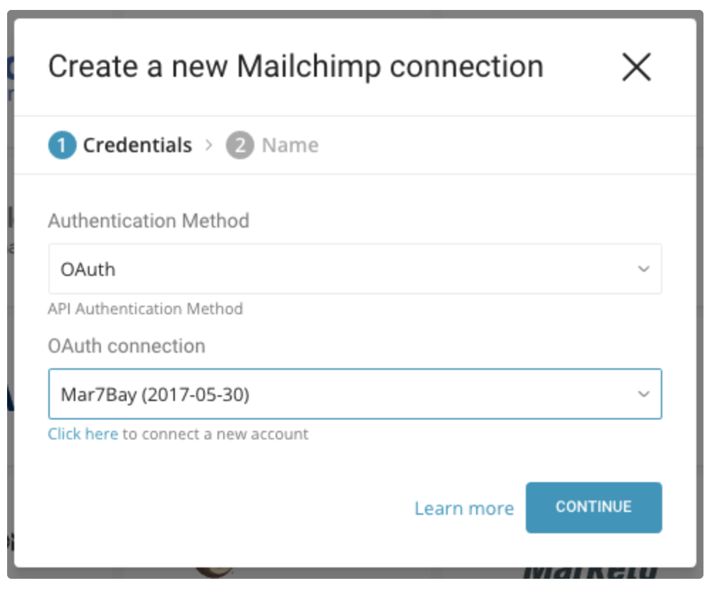 You can select an existing OAuth connection for MailChimp from the drop-down or select the link under OAuth connection to create a new one.