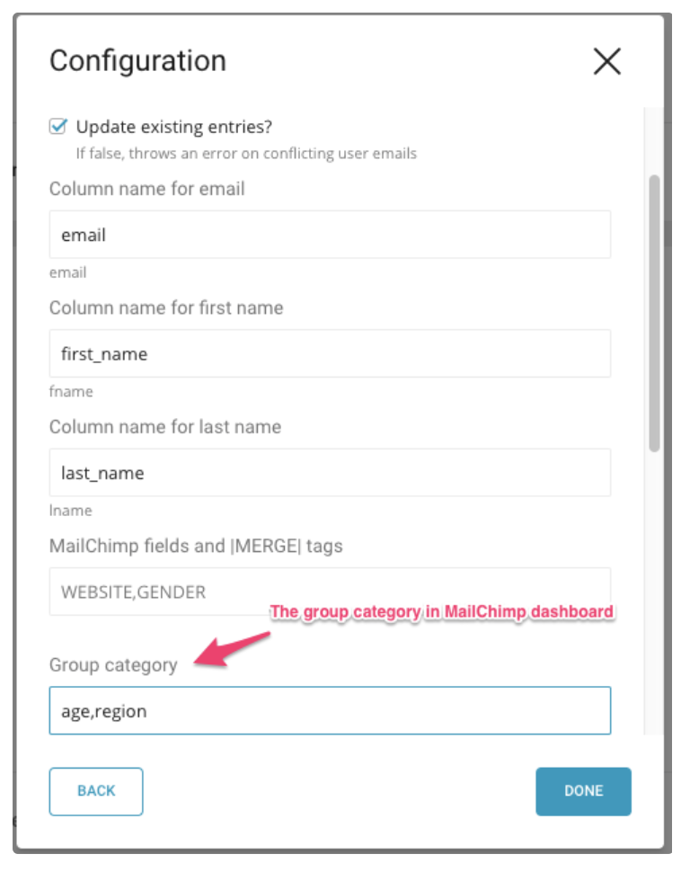 | update_existing | When toggled on, existing entries are updated with their email addresses as keys. If not, new entries are appended to the MailChimp List | false |