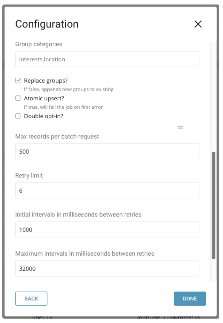 | replace_interests | When toggled on, the value of the groups for each subscriber is replaced. Otherwise, new values are appended to the subscriber’s interest group. | true |