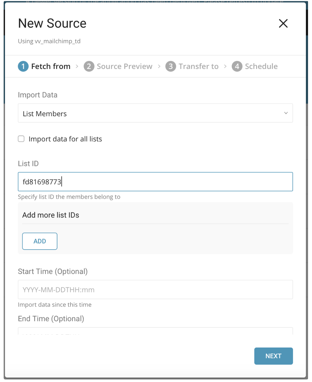 In the New Source dialog, choose List Members for the Import Data, choose whether to import data for all or specific lists, and enter the Start Time (Optional) and End Time (Optional), then select Next.