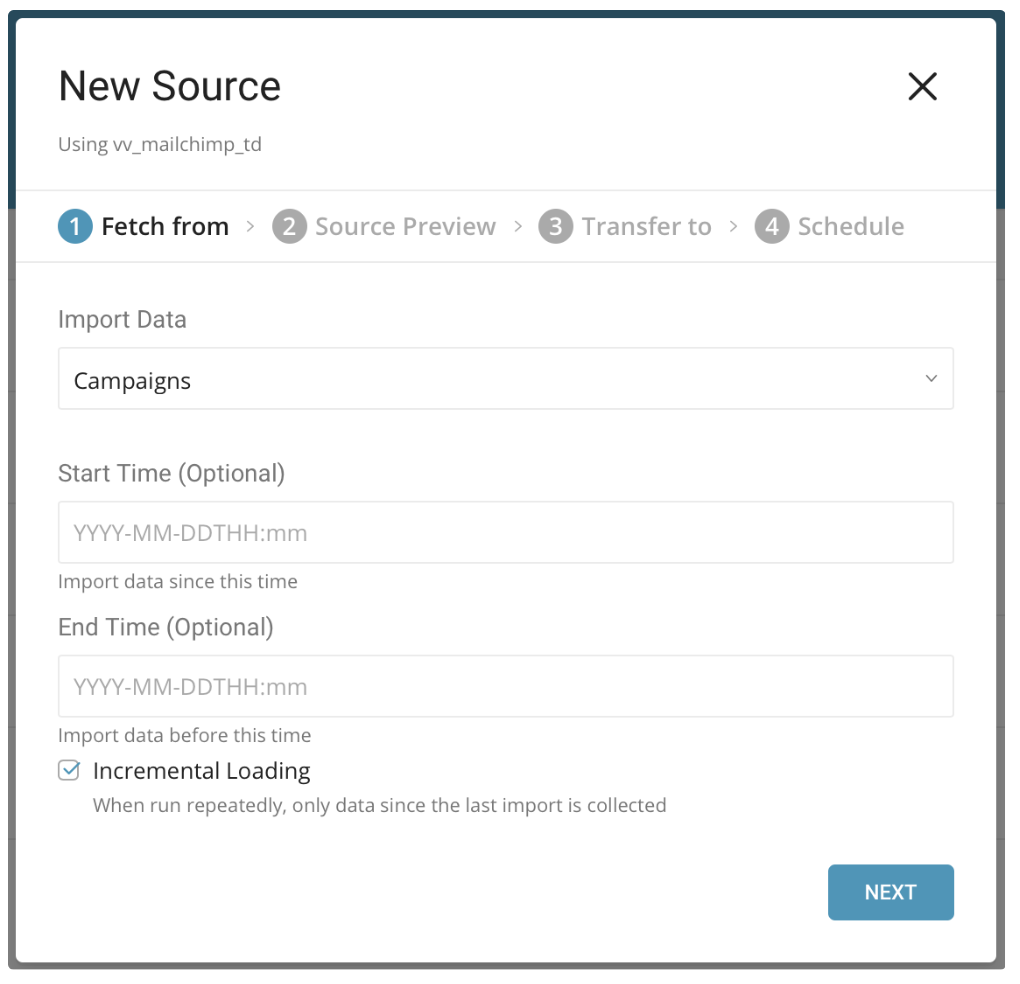 In the New Source dialog, choose Campaigns for the Import Data, and enter a Start Time (Optional) and End Time (Optional), then select Next.