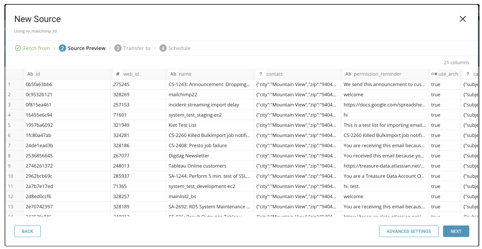 --auto-create-tableYou can schedule periodic data connector execution for periodic MailChimp import. We have configured our scheduler carefully to ensure high availability. By using this feature, you no longer need a cron daemon on your local data center.