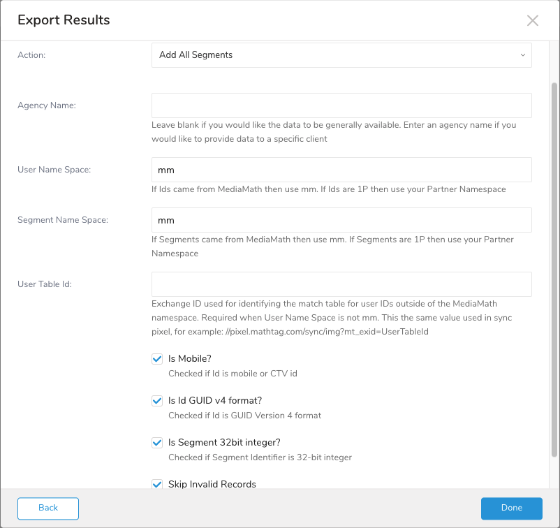| Segment Name Space | If Segments came from MediaMath then use mm. If Segments are 1P then use your Partner Namespace. Only accept alphabet and cannot be blank or empty. | |