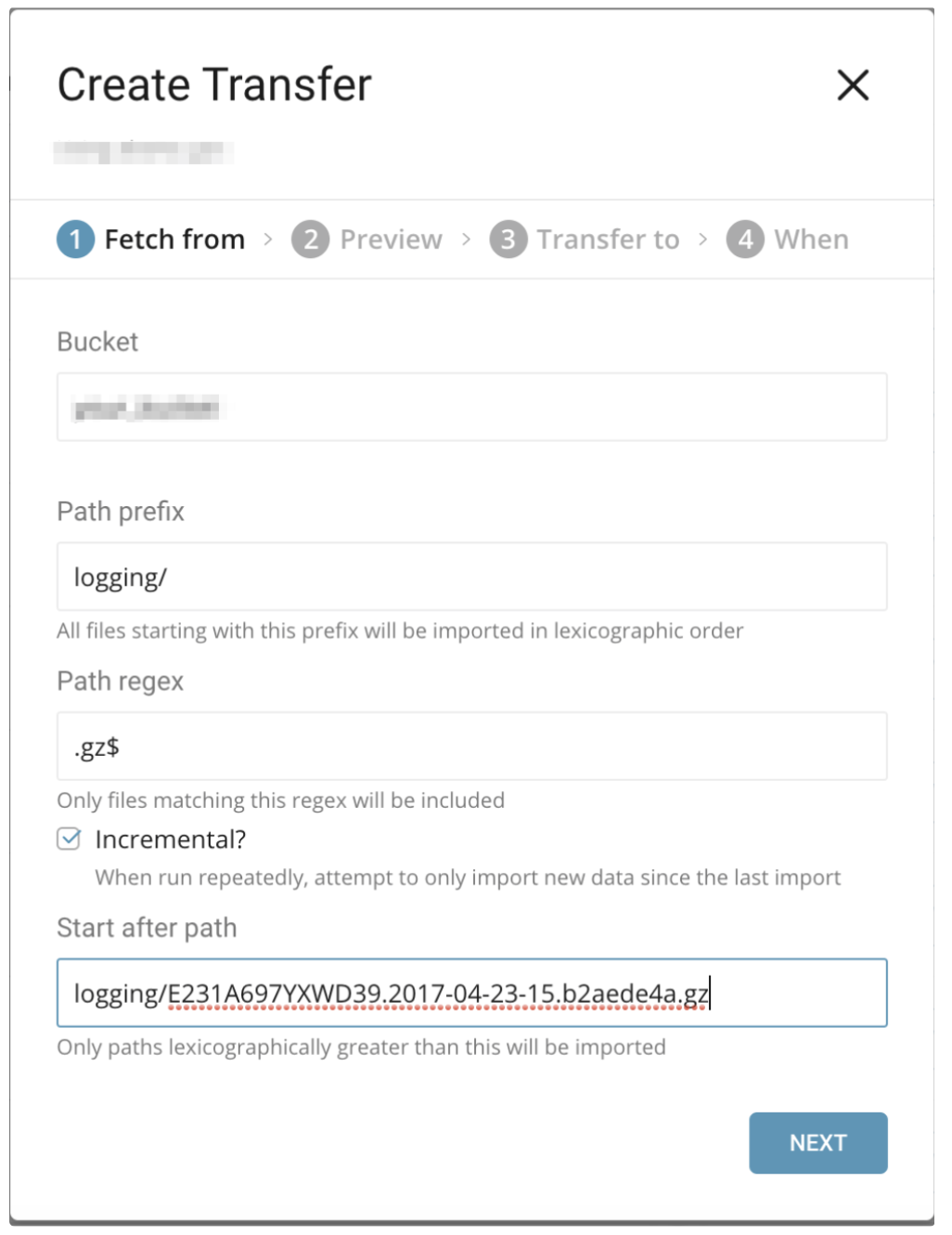 [your_bucket] - [logging] - [E231A697YXWD39.2017-04-23-16.d12f42f9.gz]In this case, “Fetch from” setting should be as shown: