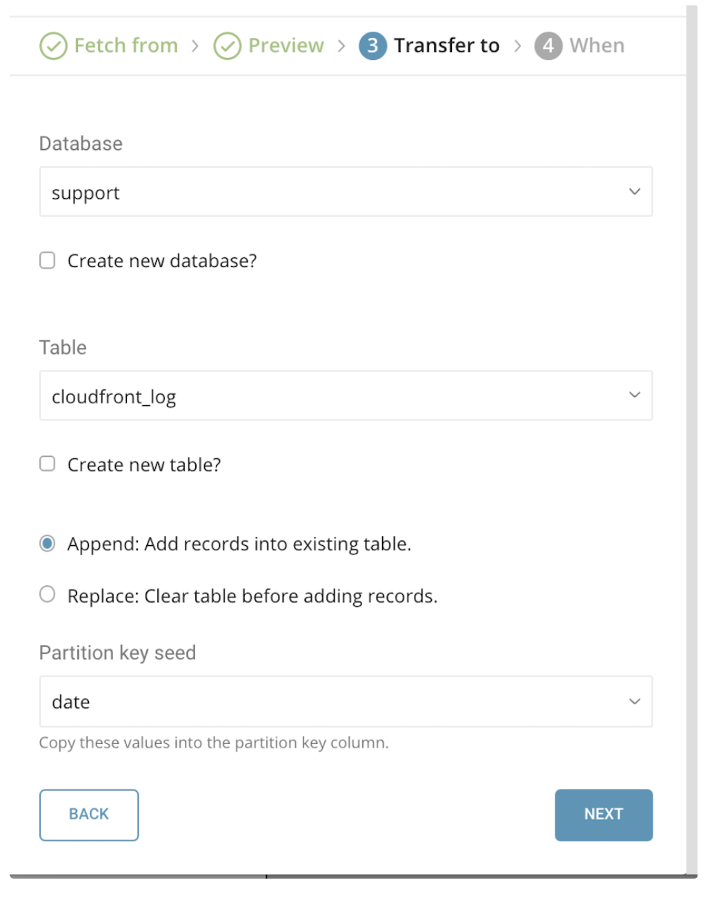 - Partition key Seed: Choose the long or timestamp column that you would like to use as the partitioning time column. If you do not specify a time column, the upload time of the transfer is used in conjunction with the addition of an add_time filter.