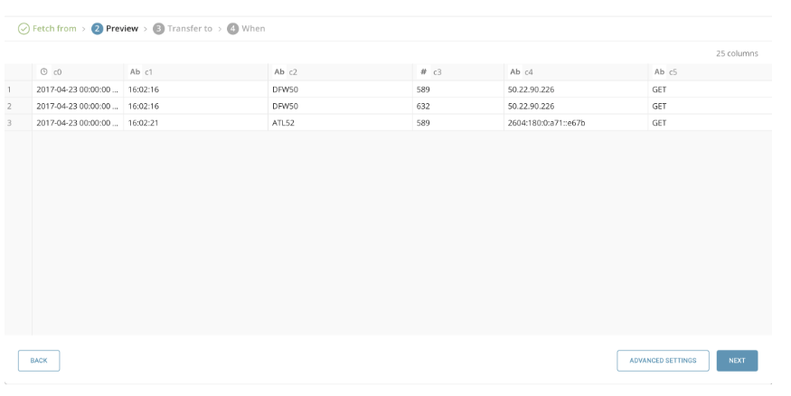 It’s also recommended to specify --time-column option, because Treasure Data’s storage is partitioned by time (see data partitioning). If the option is not provided, the data connector chooses the first long or timestamp column as the partitioning time. The type of the column specified by --time-column must be either of long and timestamp type.