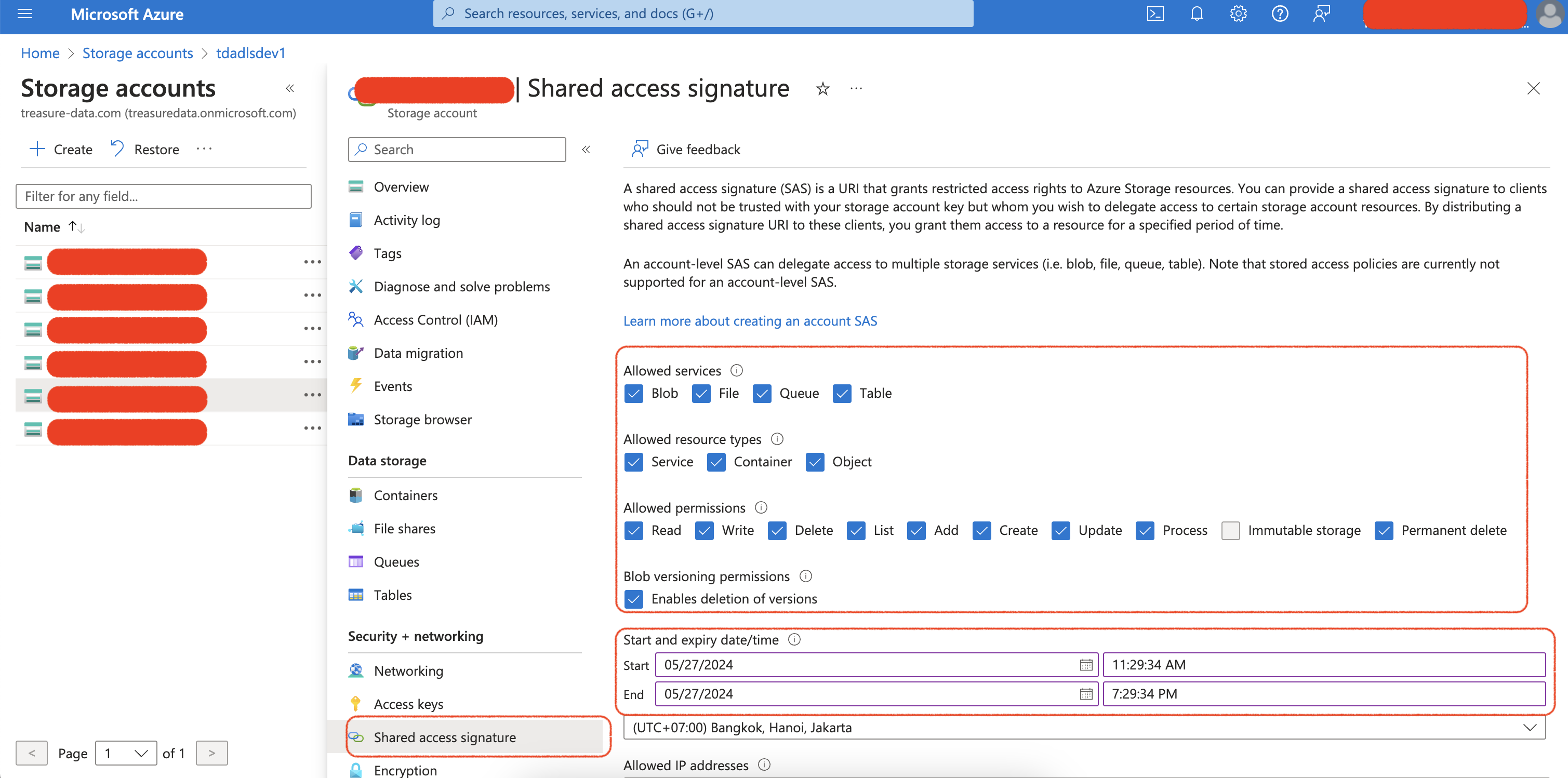 - Configure the permission & expiration date for the shared access signature.