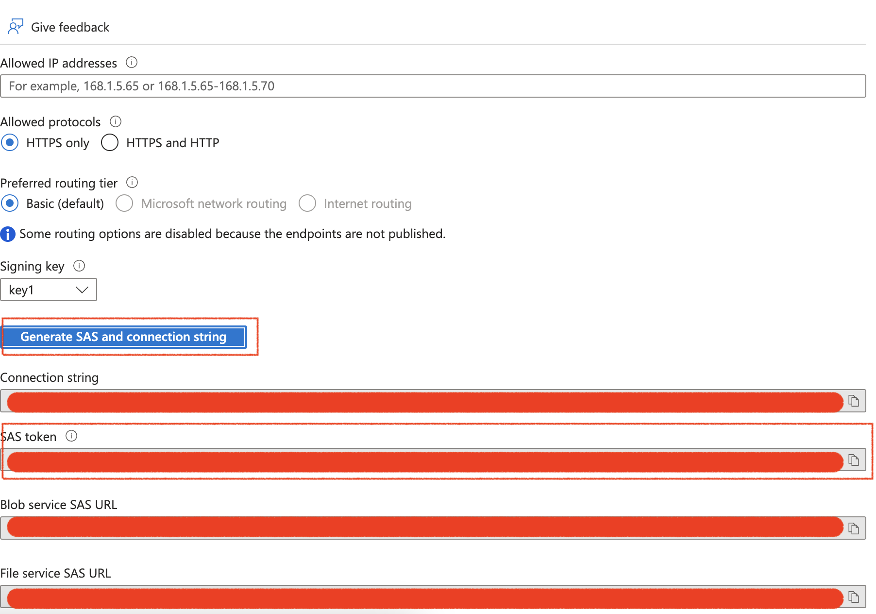- Select the Generate SAS and connection string button, and copy the SAS token.