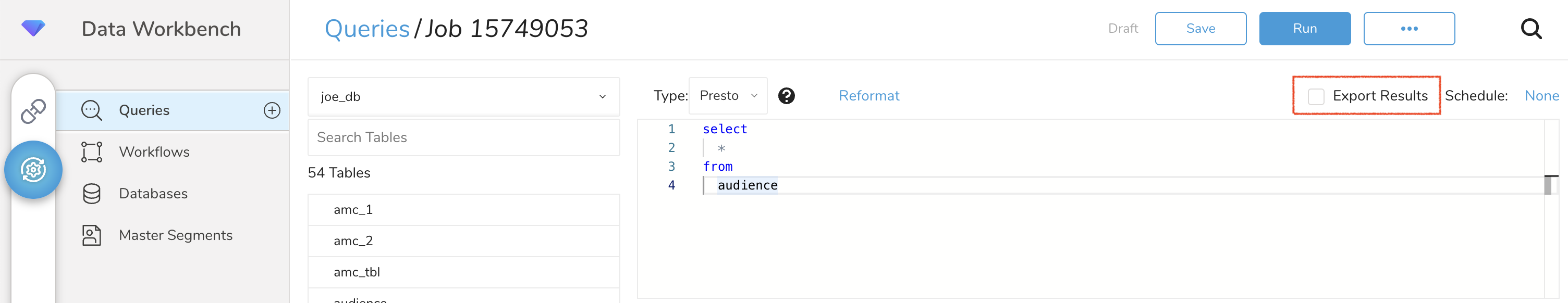 TD Console supports multiple ways to export data. Perform the following steps to export data from the Data Workbench.