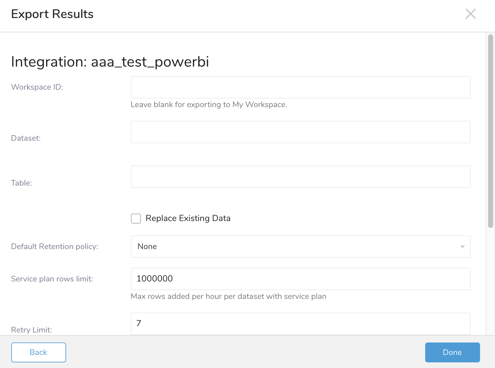 Max rows are added per hour per dataset for service plans. The free service plan allows 10,000 rows. The paid service plan allows 1,000,000 rows. 12. Select Done.