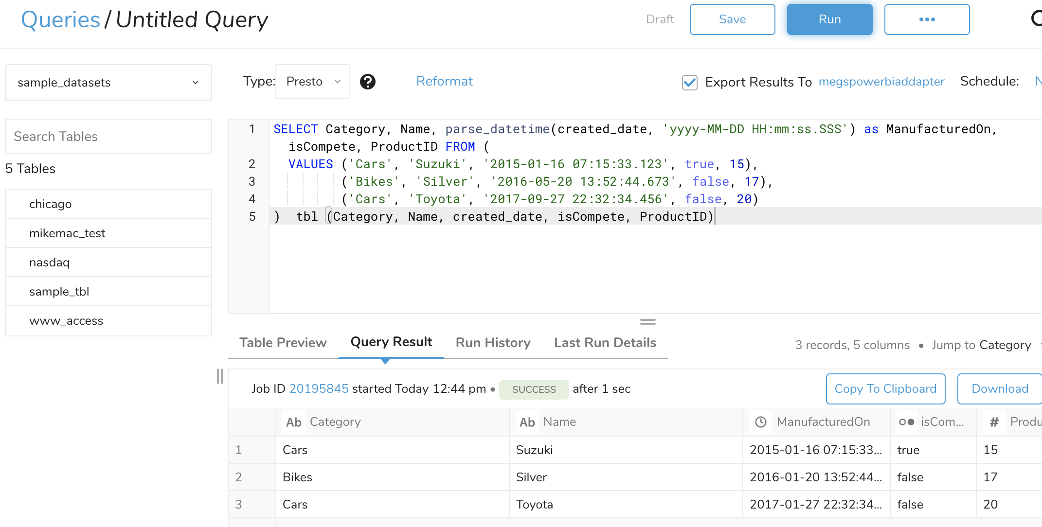 SELECT Category, Name, parse_datetime(created_date, 'yyyy-MM-DD HH:mm:ss.SSS') as ManufacturedOn, isCompete, ProductID FROM (