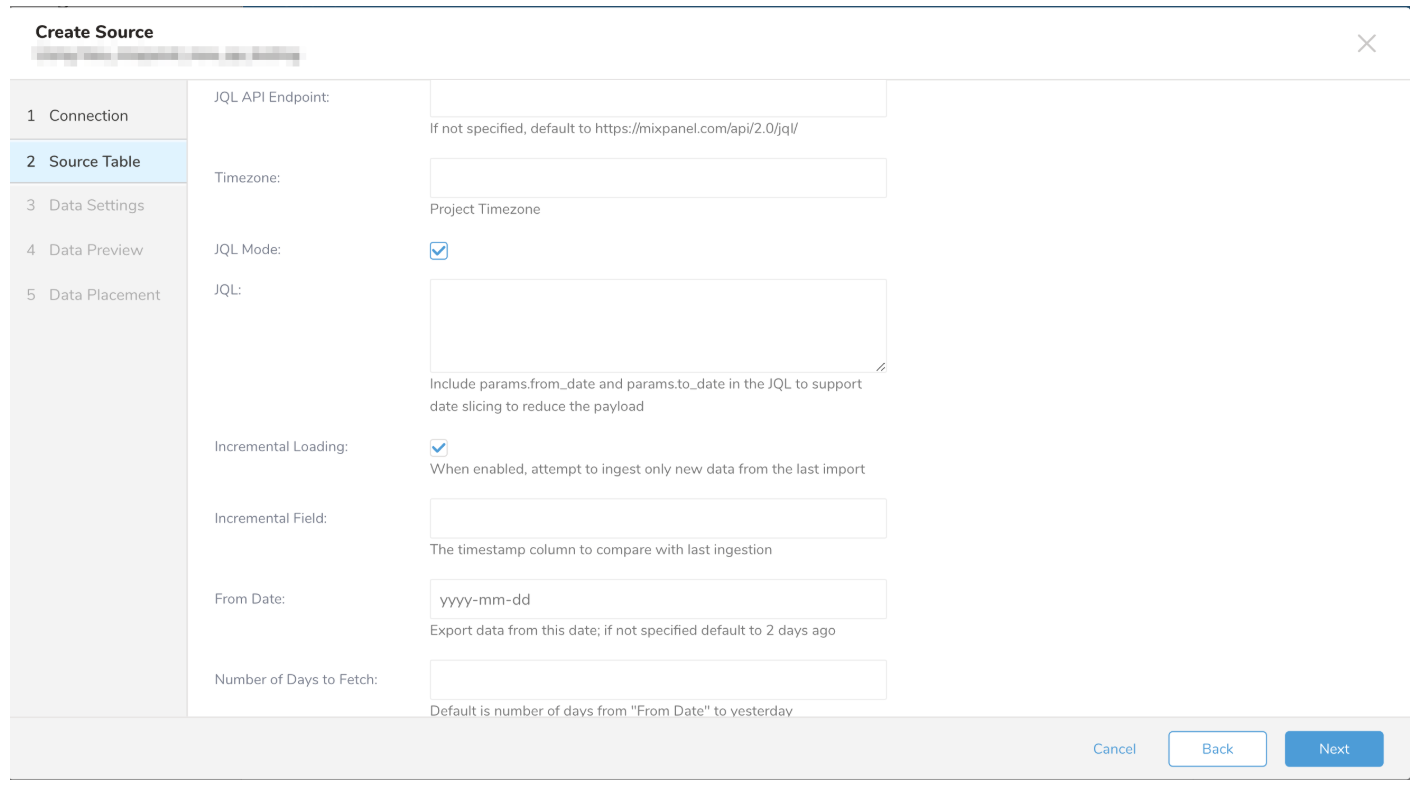 | JQL API Endpoint | The endpoint using for JQL API call. If you leave it empty the default value is https://mixpanel.com/api/2.0/jql/ |